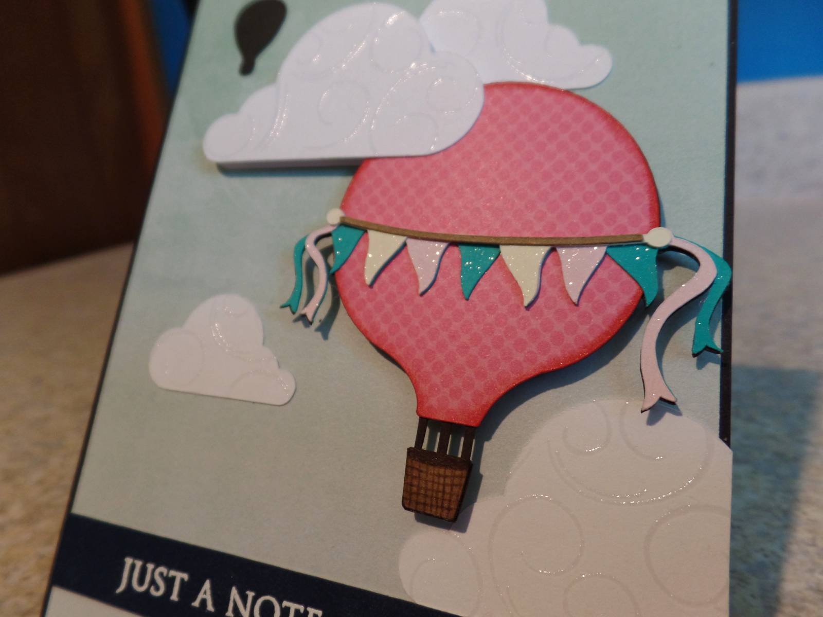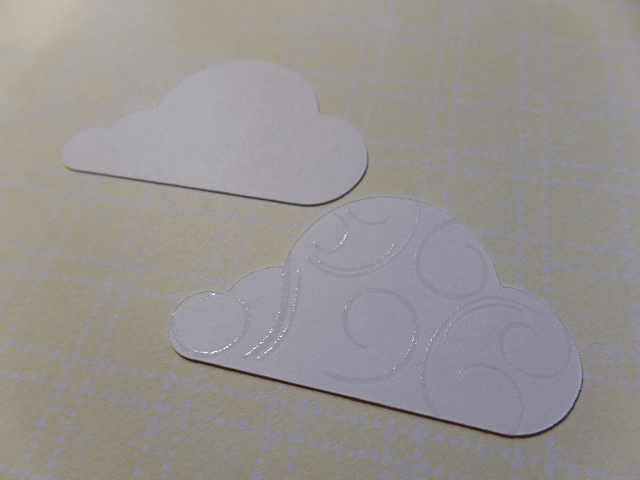 I was not happy with these above clouds; I had used an embossing folder. With my newer card I did heat embossing (my new love). I used Versa Mark ink and clear detailed embossing powder. And I am much happier with the results. Here is a close up which shows what a difference heat embossing can make.