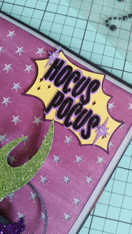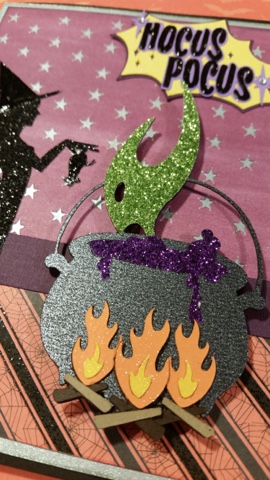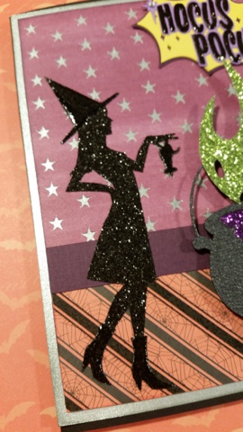 The witch shadow comes from ‘A Frightful Affair’ cartridge. I used the Slice feature in Design Space to eliminate elements I did not want to use. This is an incredible feature! The glittery paper is from the Heidi Swapp collection Marquee Love and is part of thier Halloween release…it is a great value and cuts beautifully. I used Glossy Accents on her hat and boots.