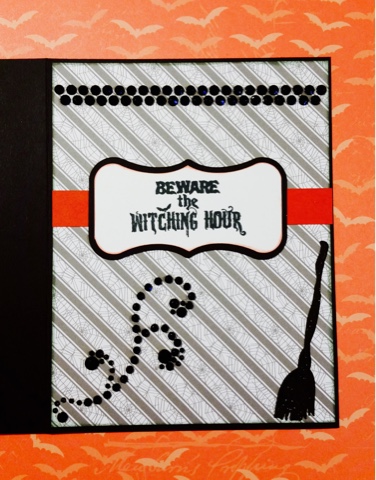 Here is a look at the inside of the card. The label is from ‘First Few Years’ and the broom is from ‘Teresa Collins – Chic & Scary’ cartridges. The sentiment stamp is from this years Michaels collection.