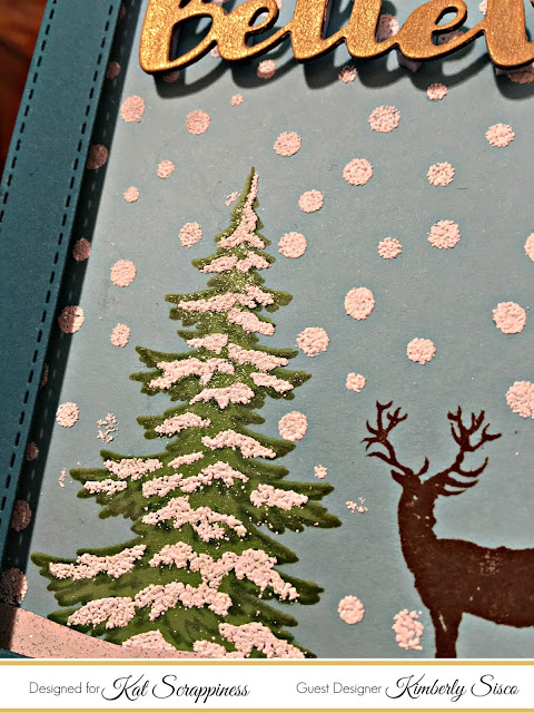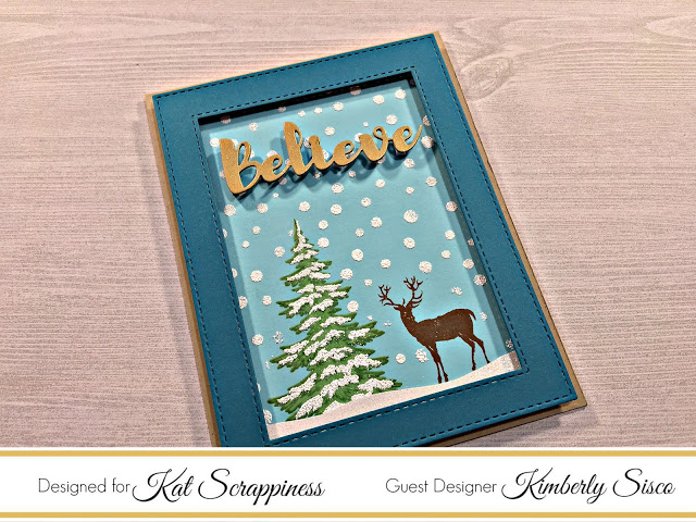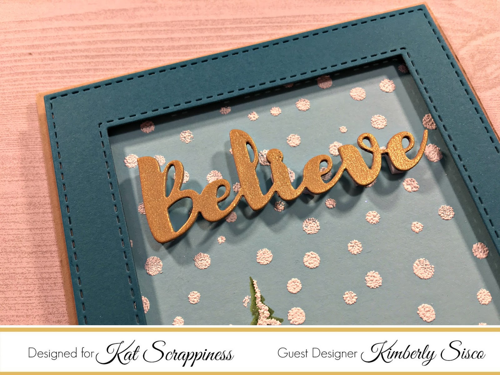 Hello Crafters! It’s Kimberly with a fun Christmas card featuring the Kat Scrappiness ‘Believe’ brush script die. Also, I used the Hero Arts Color Layering Snowy Tree stamp set. I show how to use to create the layered snowy tree in a process video – click Here or watch above.