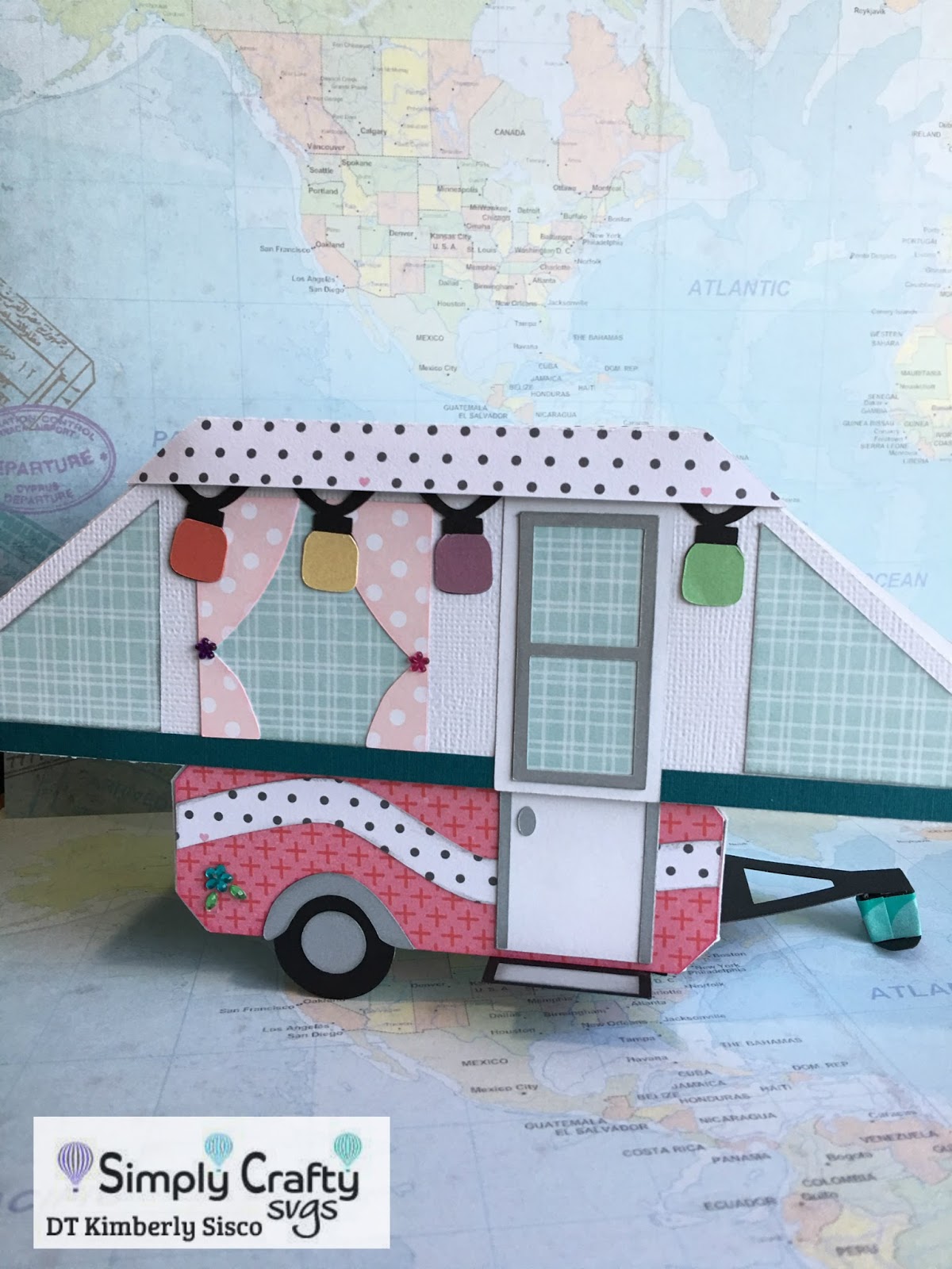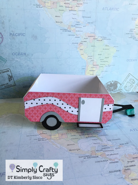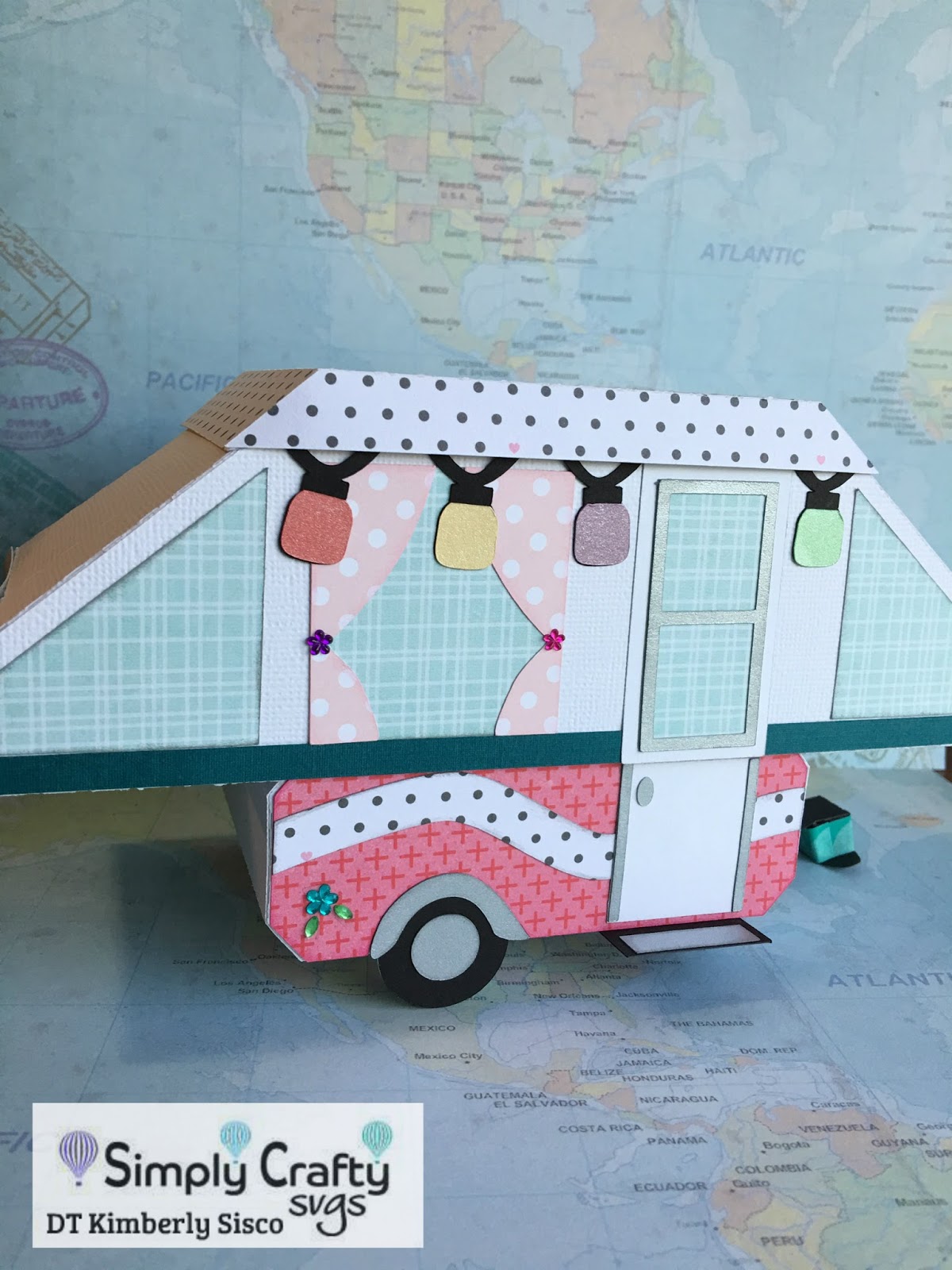 Hello Everyone! It is my pleasure to share another Simply Crafty SVGS design team project with you. As you can tell from all my post that I am a cardmaker but I was ready to step outside my comfort zone and tackle a 3D project. When I saw this Tent Trailer Box I knew this was the project for me and I wanted to make a little Glamper for my craft room.