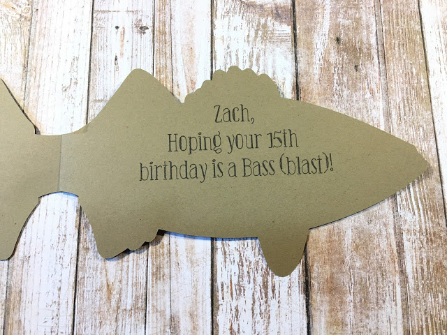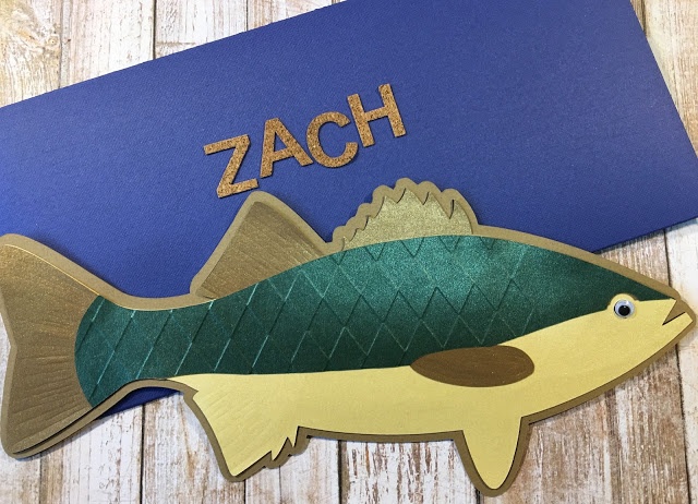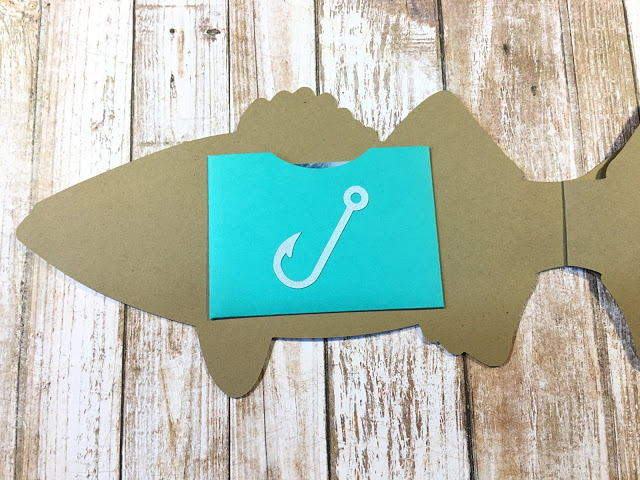 I created a gift card holder for the inside of the card to hold a precious Bass Pro gift card; this is included in the Cricut Design Space cut file and was created from a square shape. The hook is from Go Fish Scrapbook Layout and I used a silver shimmer paper. As you can see above, to create the card I cut out two of the fish shadows and glued the tails together. You can about make any shape into a card. I used kraft cardstock for the card base.