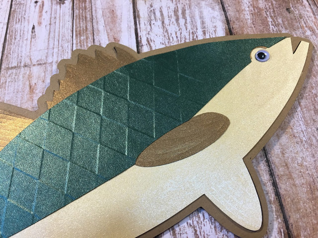 The fish image comes from Outdoor Man and measures 10.642″ x 4.86″; I used the shadow to create the base of the card. I used Cricut Pearl paper for the body and fins; pictures do not do this paper justice (see the shimmer below). I used a diamond embossing plate to give the illusions of scales and I used an embossing tool to create the lines for the fins and tail; this created more texture. And I added a googly eye to give this little guy some character.
