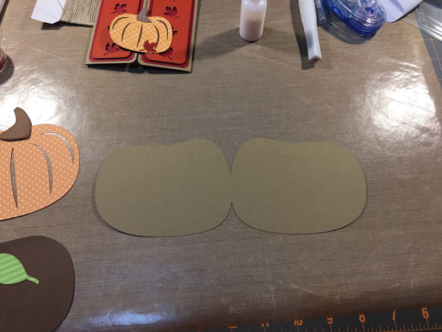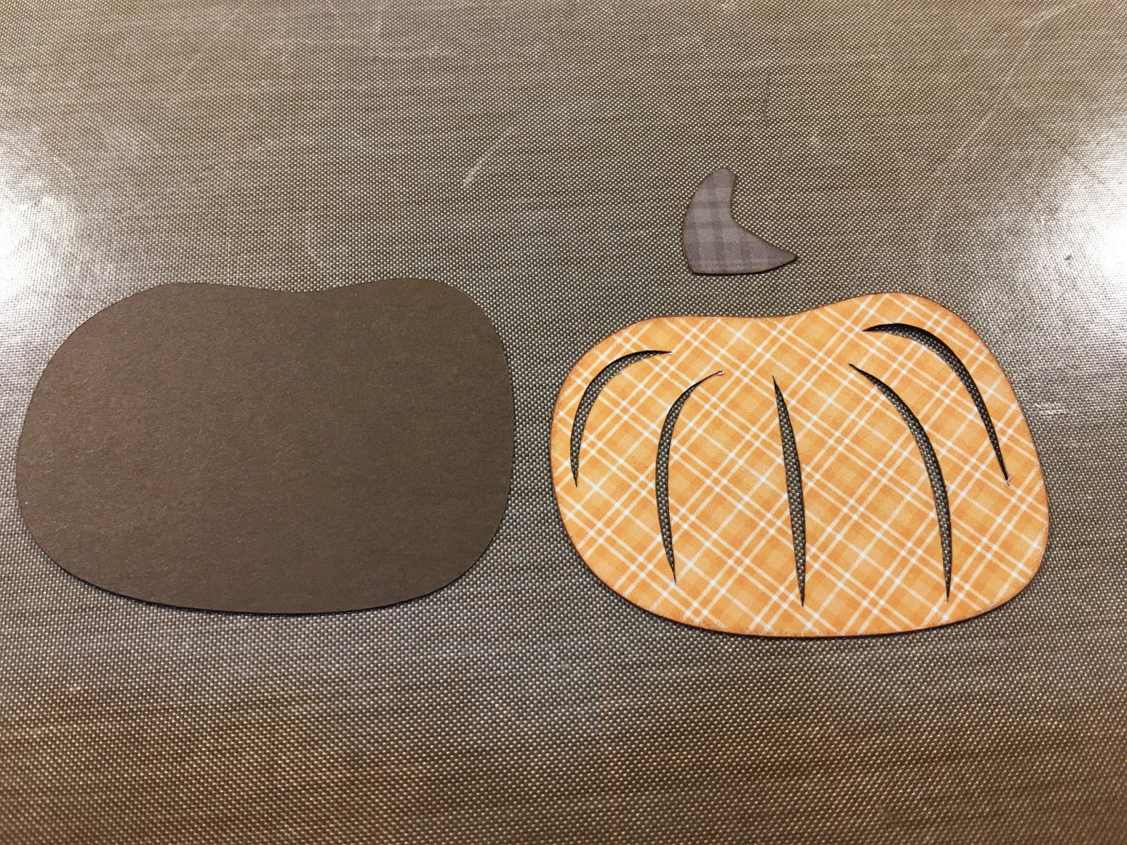 The pumpkin shaped card measures 4.75″ x 3.635″. Again, I inked most of the edges and used patterned paper for texture. The leaf and vine swirl are images from Cricut Design Space and are included in the Cricut Design Space Access Subscription. I added a bow to the stem with Stampin’ Up linen twine. Below are some process photos as I assembled the pumpkin shape card…FUN!